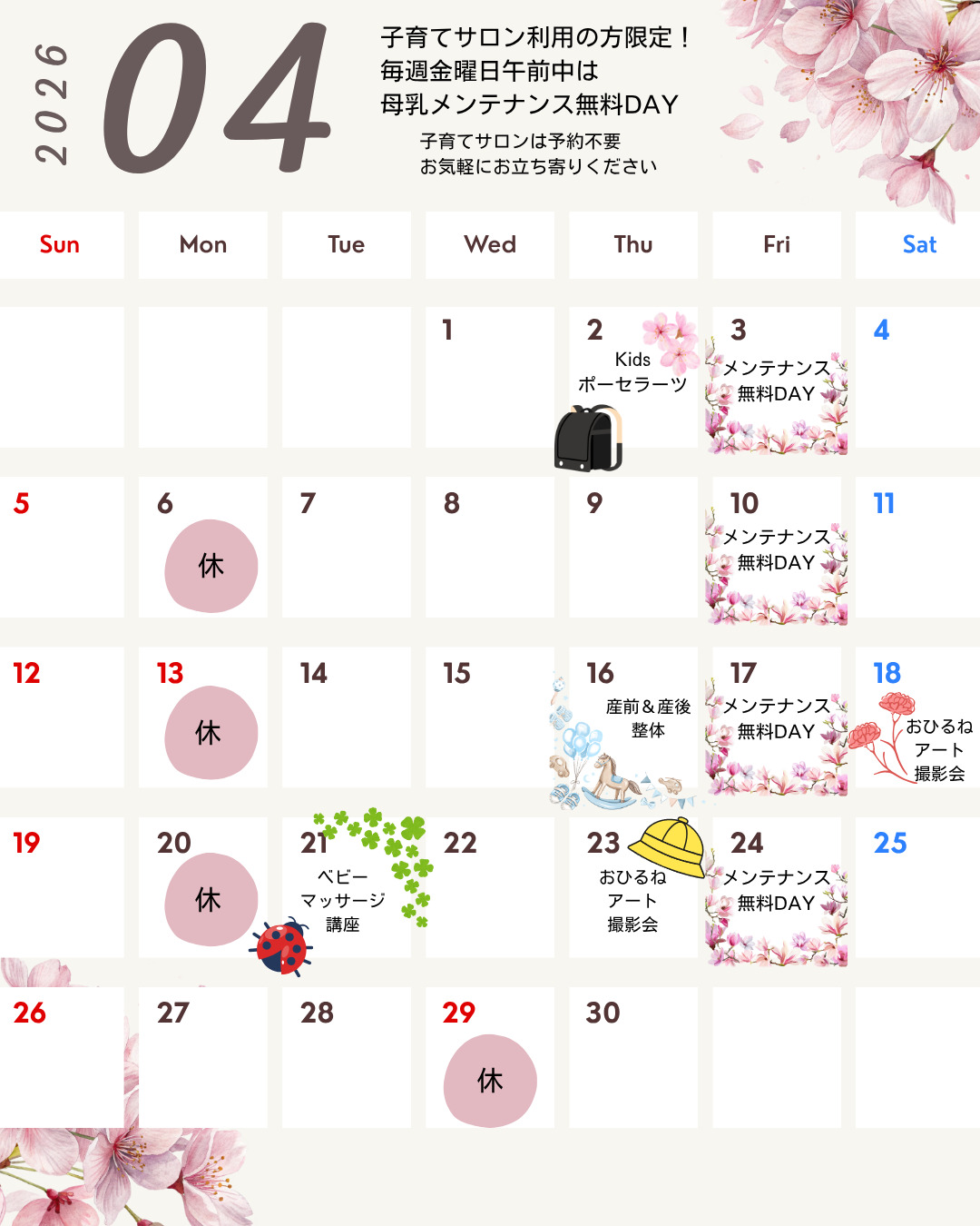 毎週金曜日午前中に子育てサロン利用時無料で助産師によるメンテナンスを行います