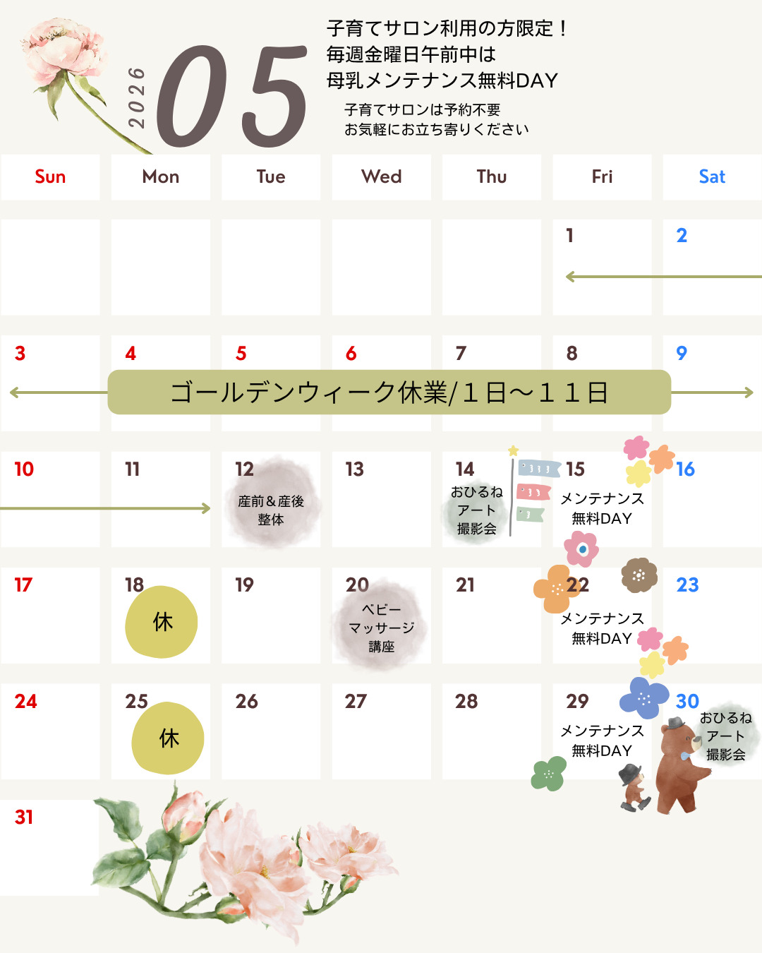 毎週金曜日午前中に子育てサロン利用時無料で助産師によるメンテナンスを行います